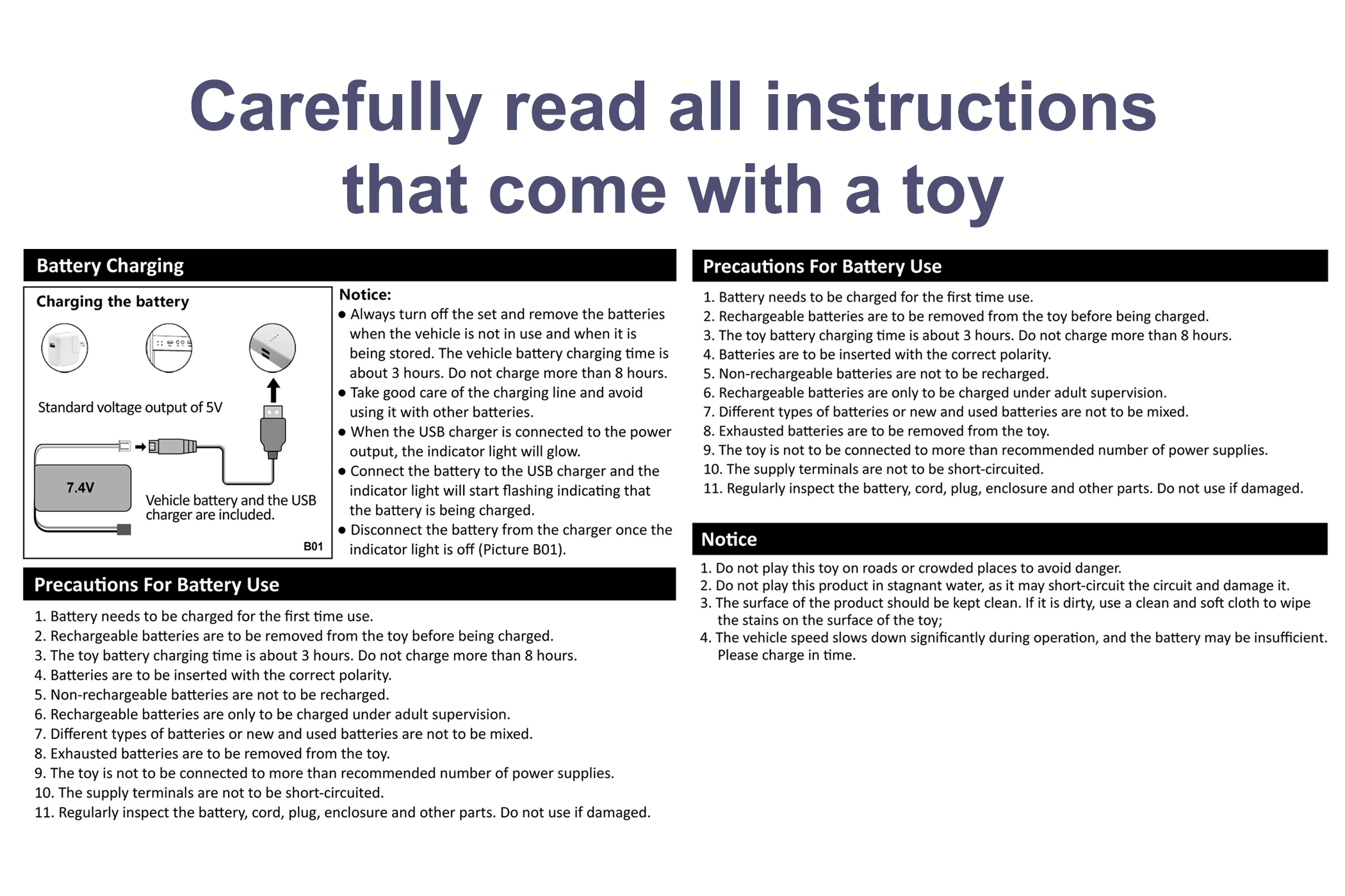 7. Never allow your child to charge batteries. Charge batteries on safe non flammable floor away from flammable objects and away from children.